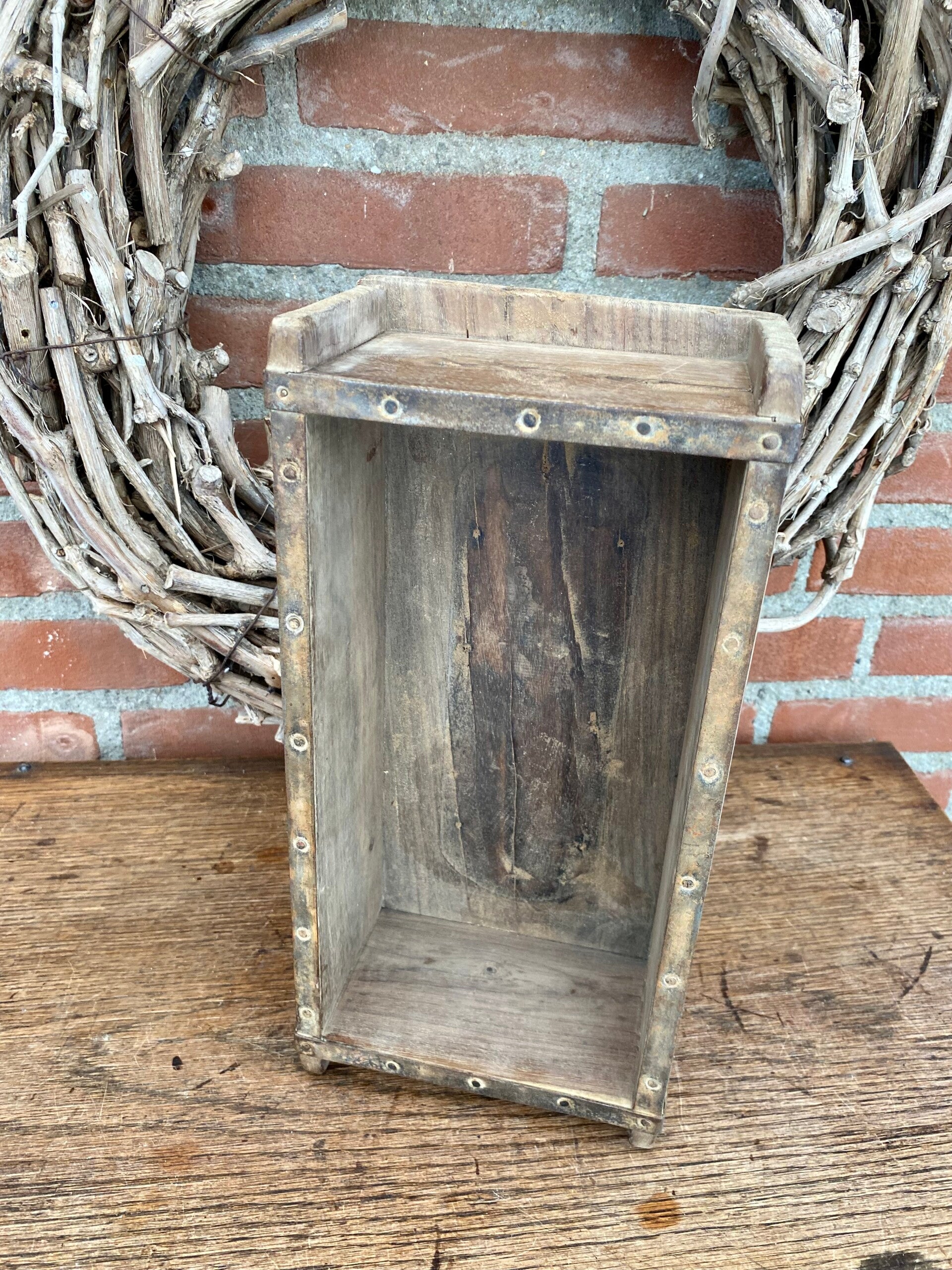 Houten industriële steenmallen met een ijzeren rand ter afwerking. Afm.: 31,5x14,5 cm. Het kan zijn dat de hout kleur afwijkt van de foto.