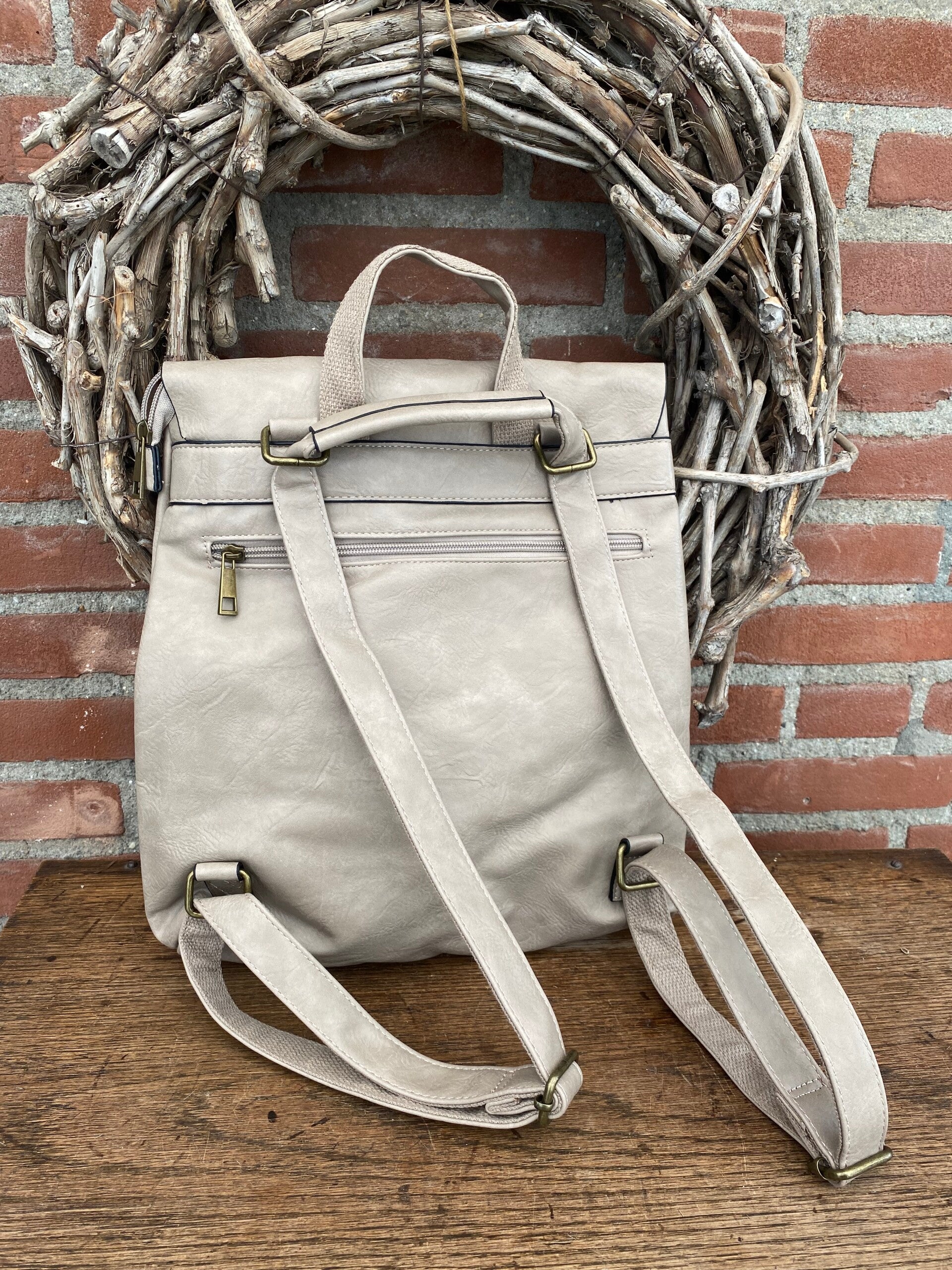 Schoudertas en rugzak in 1, in de kleur beige licht zandkleur) Afsluitbaar met rits en drukknopen. Voorzien van 2 binenzakken. Afm.: 37 cm hoog en 32 cm breed